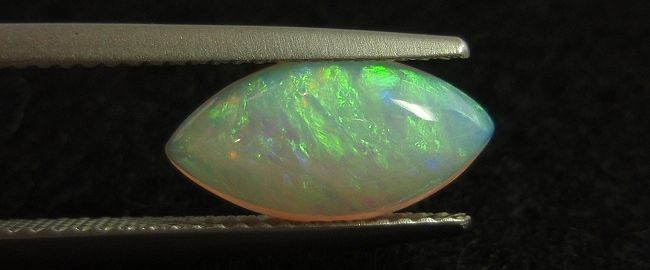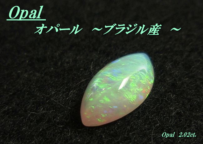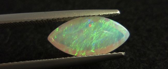 オパールであまり見かけないマーキスシェープのボディーにグリーン系をメインとする遊色効果の虹色が魅力です。